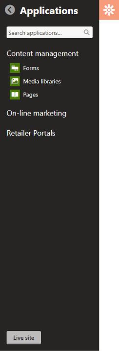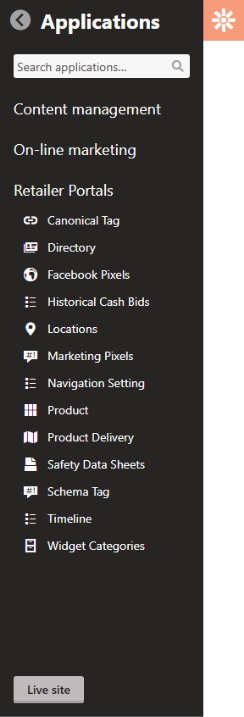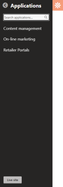 Clicking on the cogwheel icon slides open the Applications selection menu and provides access to a Live Site button.