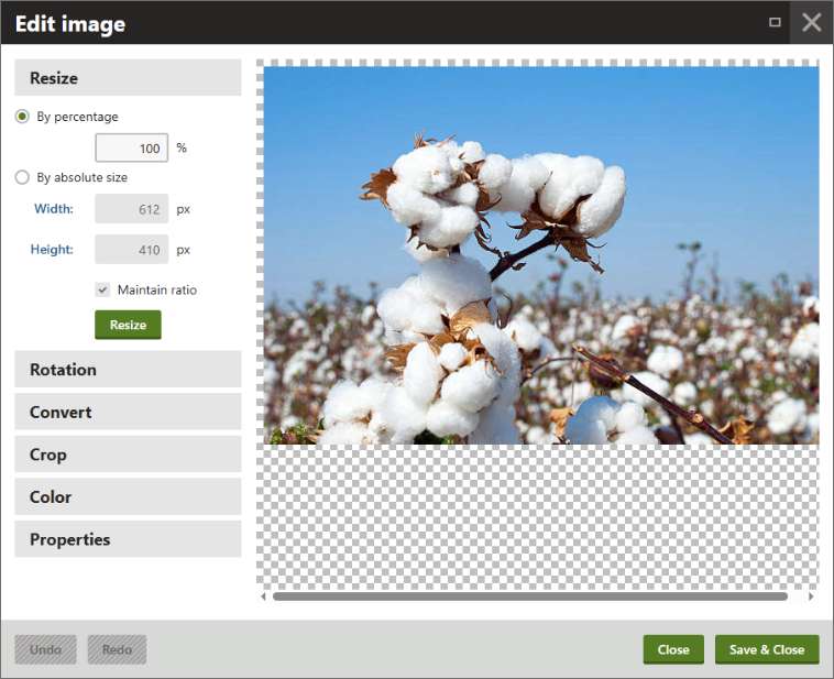 Cropping of an image can easily be done by clicking on the image and pulling the handles of the selection box as needed. Fine-tune the size using the width and height settings in pixels. Check maintain ratio to avoid squishing the image.