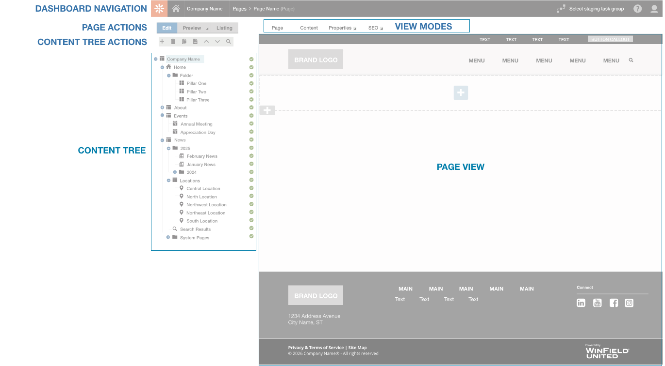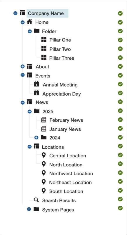 This is a tree-like representation of the entire website organized in a hierarchy. Each page type in the tree has an icon to identify it. These pages are controlled by the Content Tree Actions as discussed above. To learn more about the various pages types that can be added to the content tree, visit the ATLAS Page Types support page.