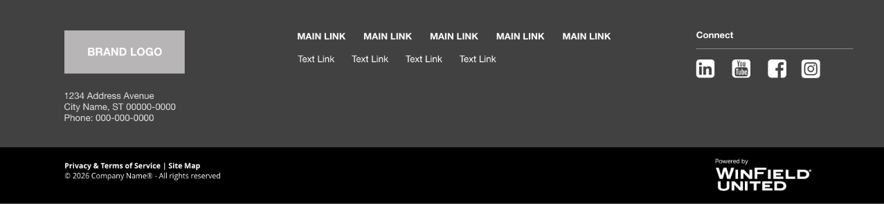 The footer appears automatically at the bottom of every page of the website unless specifically suppressed. Footers are customized to meet the needs of an individual client and are designed by an Atlas UX team member. The content typically features a brand logo, the main business address and phone, key page links and direct links to social media properties. Beneath the custom footer area there is copyright information and links to the site map and privacy policy plus a small Winfield United Atlas logo.
