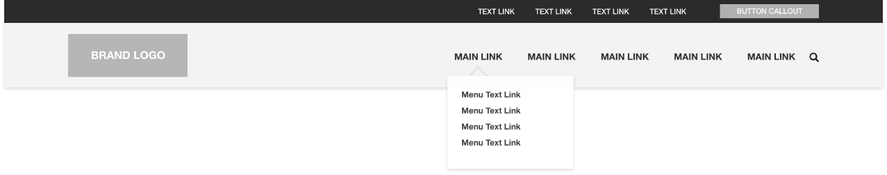 The page header appears automatically at the top of every page of the website unless specifically suppressed. It is typically composed of a brand logo which is clickable and takes the visitor to the home page, plus a main menu area of primary links with optional drop-down menus of secondary links, and a secondary navigation area of text links at the very top. On mobile these elements are reduced to a logo and a simplified menu that accesses the same main navigation links.