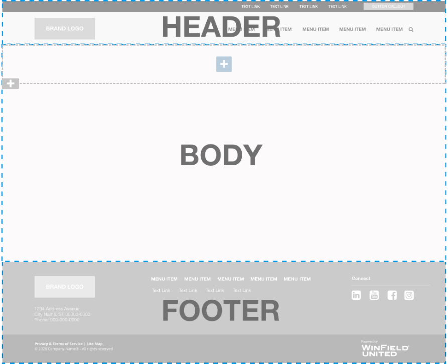 It is helpful to step back and consider the foundational building blocks of an Atlas web page. An Atlas web page consists of three parts: the header, the body and the footer. When a new blank page is added to a site the header and footer are automatically pulled in. The body area has an initial grid layout to kickstart building the page.